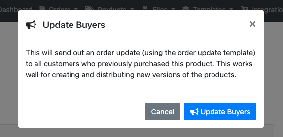 You'll see a dialog that confirms whether you'd like to update all customers who previously purchased the product. Click "send update":